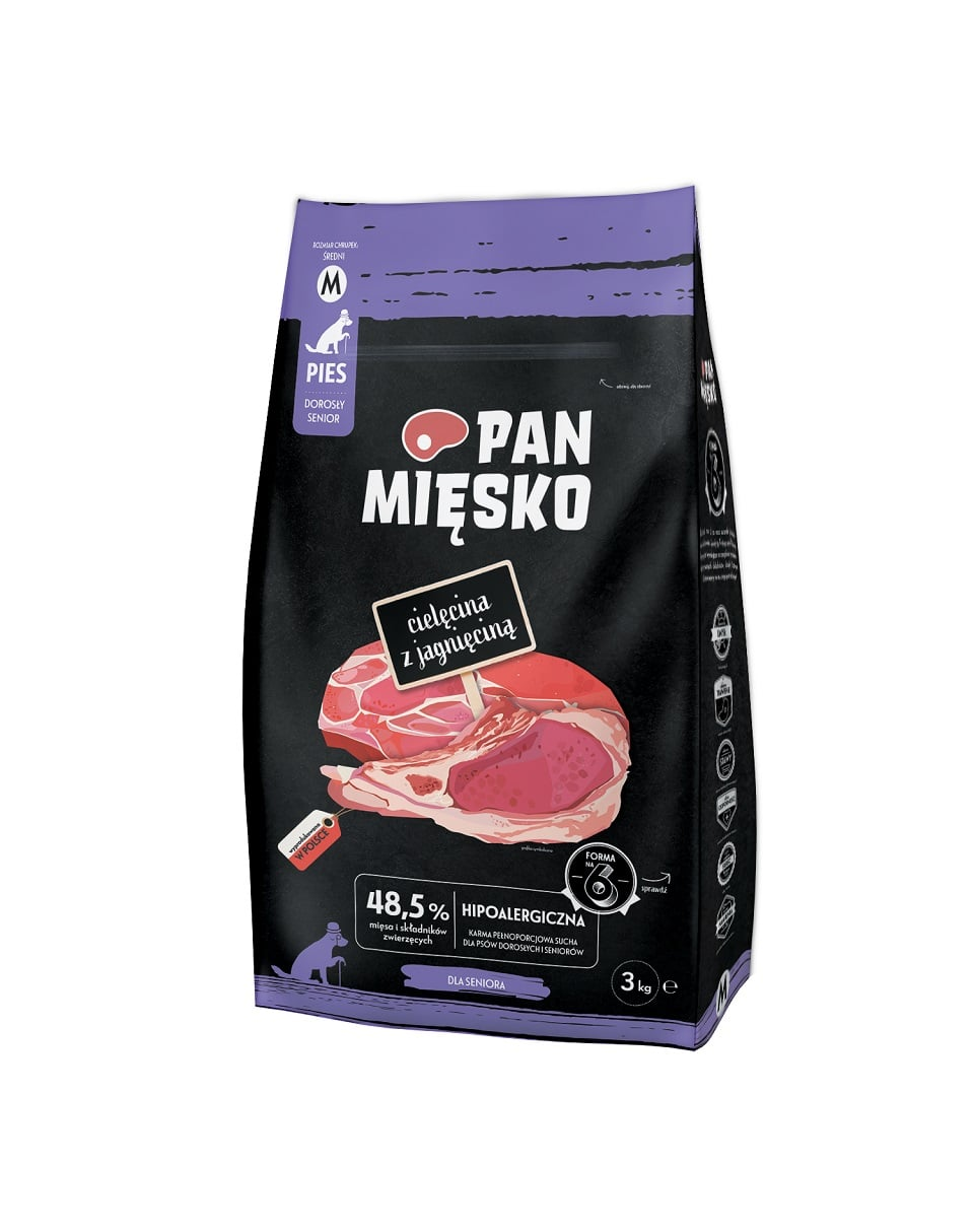 Mr Meat Calf with Lamb este o formulă preparată pe baza nevoilor speciale ale câinilor mai în vârstă și seniorilor. Conține o cantitate adecvată vârstei de proteine nutritive. Cantitatea redusă de grăsimi are un efect pozitiv asupra funcționării ficatului și pancreasului organismului matur. Adaosul de acizi Omega - 3, glucozamină și sulfat de condroitină ajută la susținerea articulațiilor sănătoase, iar adaosul de taurină ajută la susținerea inimii. În această formulă, am înlocuit mazărea nutritivă cu igname și cartofi ușor digerabili, astfel încât, cu sprijinul extractului de Yucca Mojave și al adaosului de prebiotice MOS și FOS, alimentul este ușor digerabil și are un efect pozitiv asupra sistemului digestiv și digestiv.