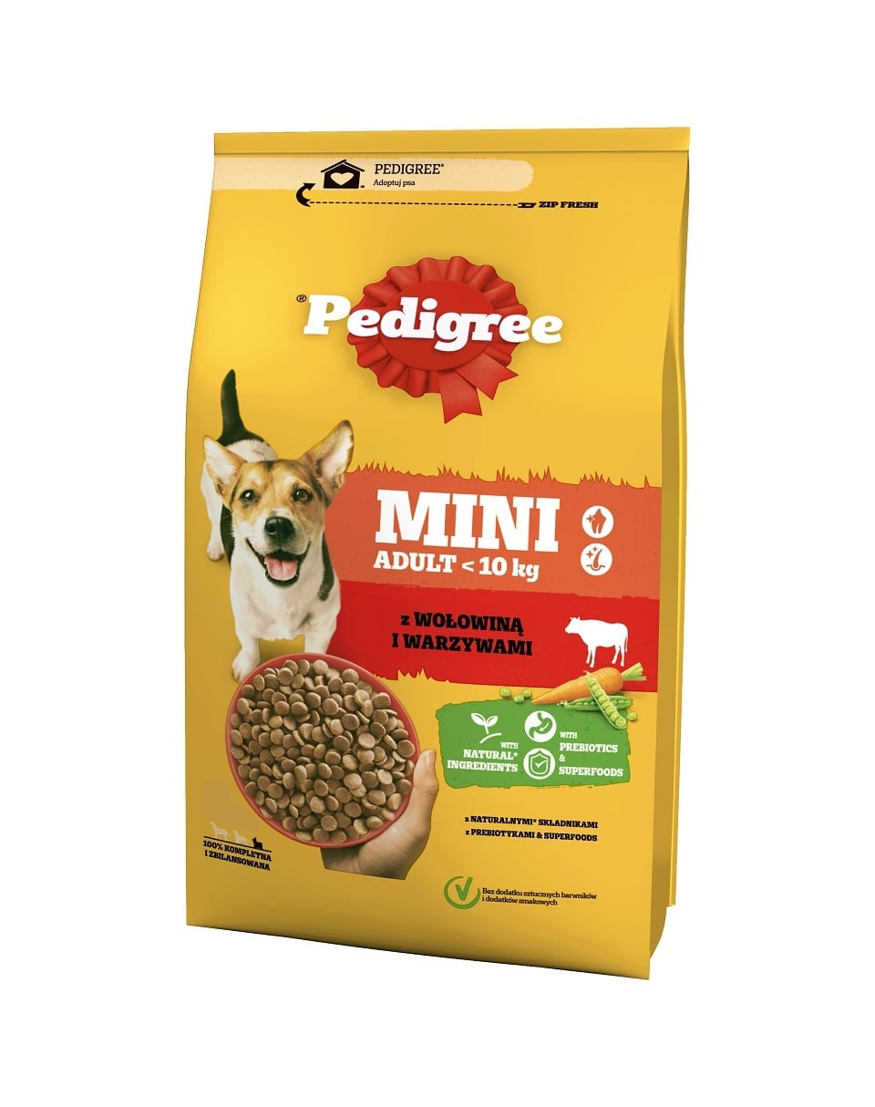 PEDIGREE Adult Mini cu vită și legume este o hrană uscată completă, special formulată pentru câinii adulți de talie mică. Rețeta a fost dezvoltată de medici veterinari și nutriționiști din cadrul Institutului WALTHAM și conține prebiotice și superfoods – morcov (sursă de vitamina A din beta-caroten) și mazăre (sursă de fibre și minerale) – pentru susținerea digestiei sănătoase și a unei condiții fizice optime.