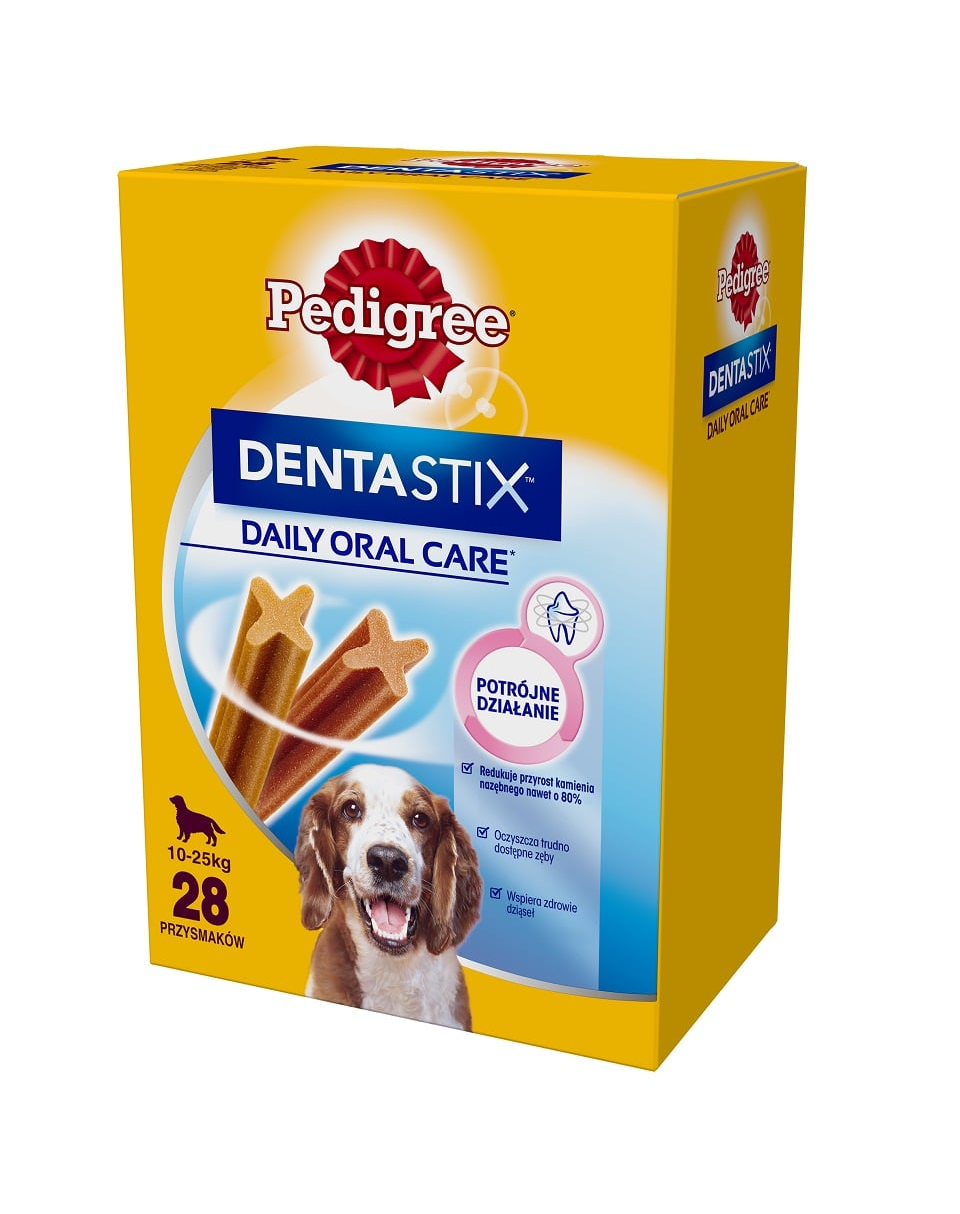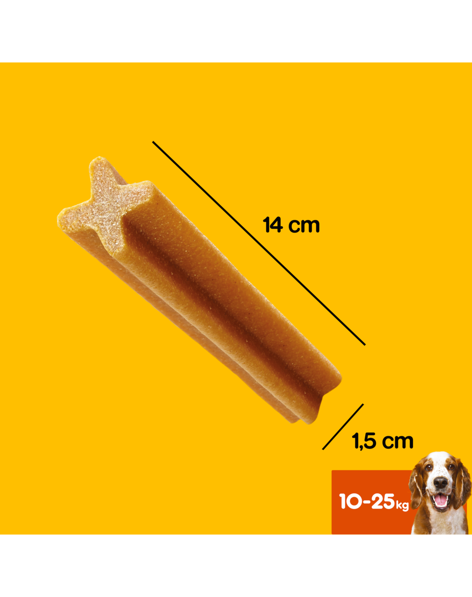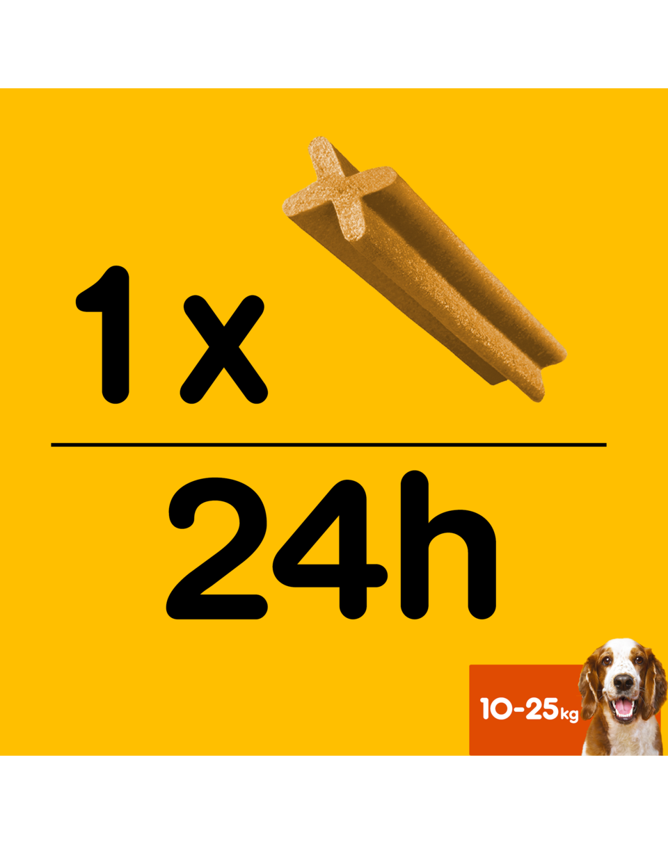 PEDIGREE DentaStix Daily Oral Care este o hrană complementară pentru câini cu vârsta de peste 4 luni. Această recompensă este destinată exclusiv câinilor cu greutatea cuprinsă între 10 și 25 kg.