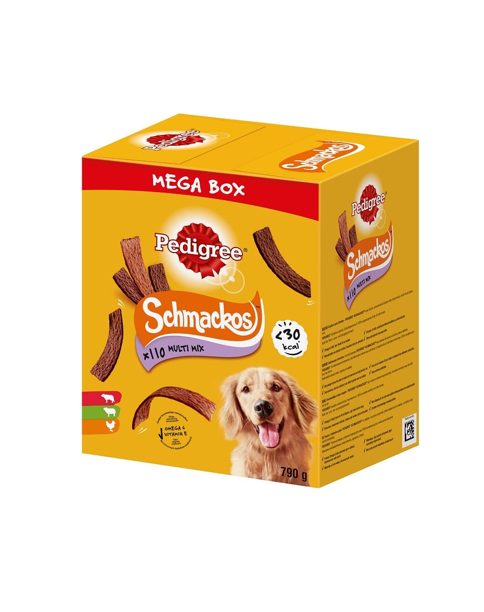 Dacă doriți să adăugați varietate la dieta câinelui dumneavoastră, alegeți PEDIGREE Mega Box SchmackosTM. Această hrană complementară nu conține arome sau coloranți artificiali și este bogată în vitamine, minerale și acizi Omega-3. Benzile cărnoase cu arome de vită, miel și pasăre pot fi împărțite în mod convenabil în bucăți mai mici, care sunt potrivite ca recompensă în timpul jocului și antrenamentului. Cu SchmackosTM, puteți fi siguri că îi oferiți câinelui dumneavoastră o gustare delicioasă. Rețeta sa a fost dezvoltată în colaborare cu nutriționiști și medici veterinari de la Institutul de Zootehnie WALTHAM.