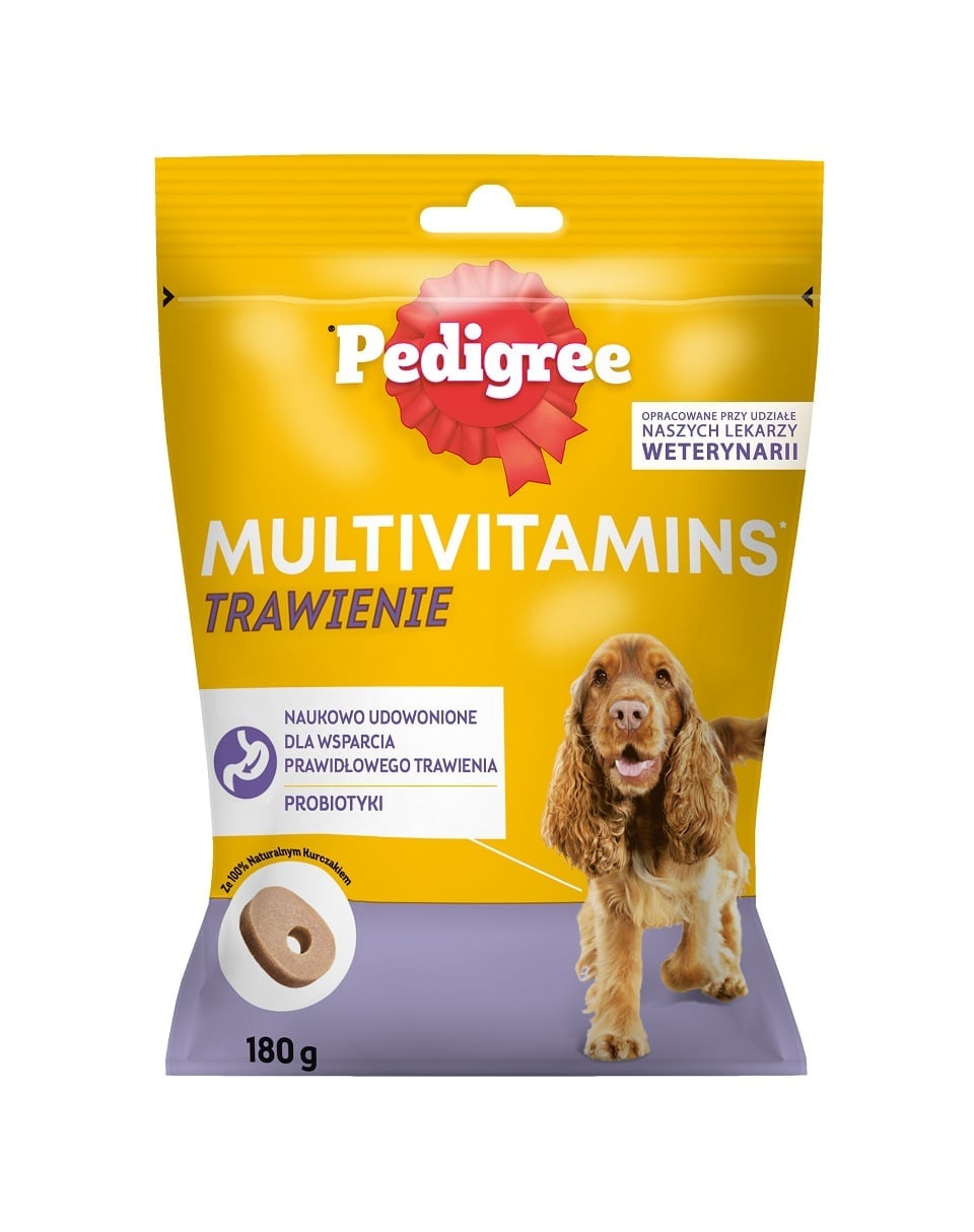 PEDIGREE Multivitamins Digestie este o gustare funcțională delicioasă, cu pui 100% natural, concepută special pentru a sprijini sănătatea digestivă a câinilor adulți. Formula este îmbogățită cu probiotice (Bacillus velezensis) care ajută la menținerea echilibrului florei intestinale și susțin un tranzit digestiv optim.