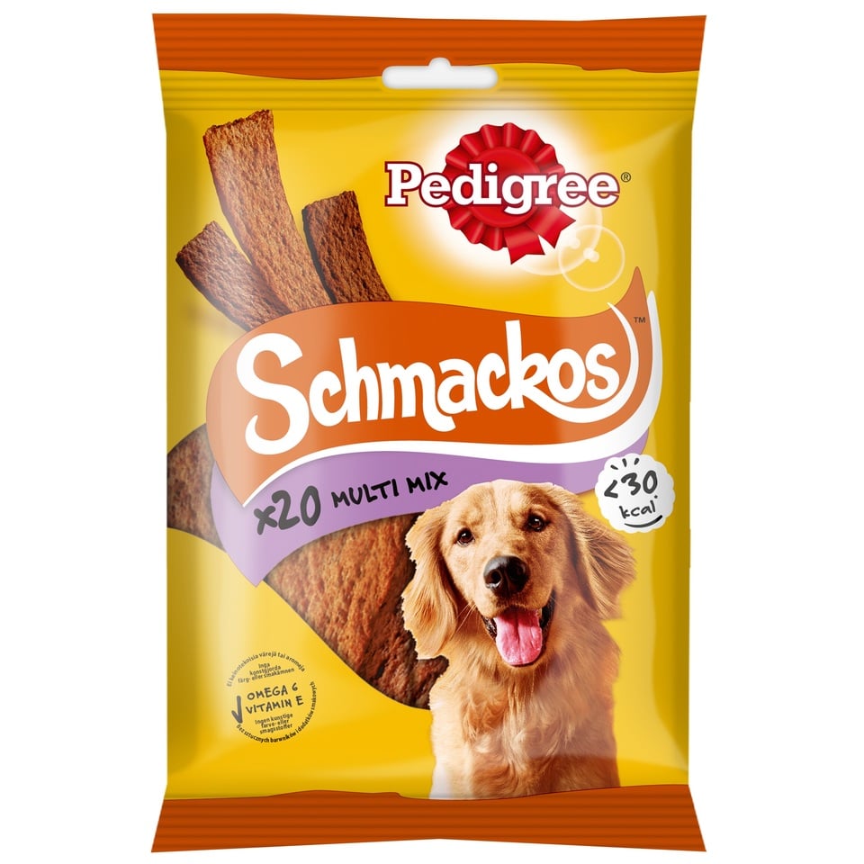 PEDIGREE SchmackosTM Multi Mix gustare pentru câini sub formă de benzi, ușor de rupt în bucăți mici. Ideală pentru plimbări, dresaj și joacă cu câinele dumneavoastră acasă. PEDIGREE Schmackos sunt un adaos perfect la dieta zilnică a câinelui dumneavoastră, oferind nutrienți esențiali precum vitaminele A și E și fier. Această gustare pentru câini a fost dezvoltată cu implicarea medicilor veterinari și a experților în nutriție de la Wellhow Institute of Animal Science. Această recompensă pentru câini nu conține coloranți sau arome artificiale. Mai puțin de 30 de calorii per baton!