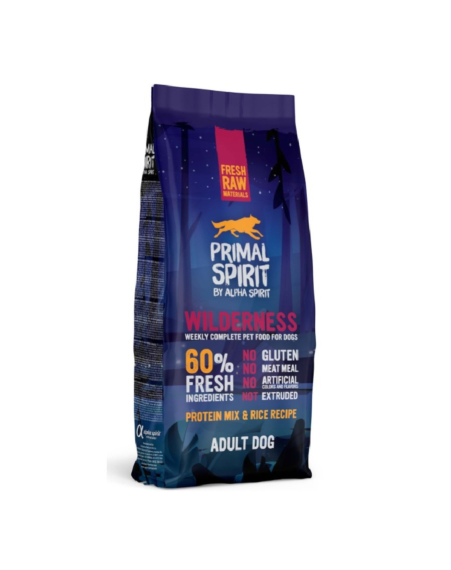 Primal Spirit Wilderness este o hrană pentru câini adulți semi-ușoară, fără gluten, cu orez și carne de porc.