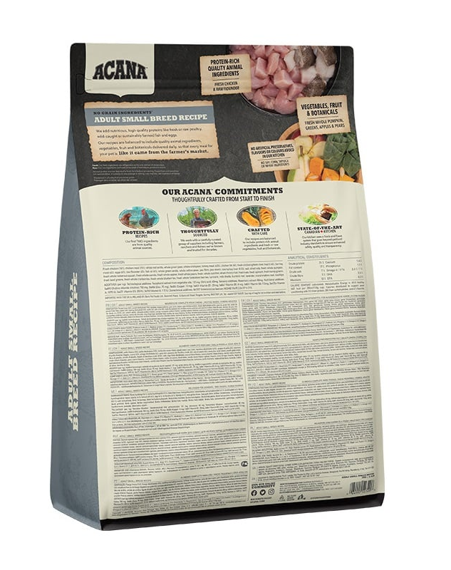 De accea ACANA Adult Small Breed este încărcată cu păsări crescute liber, plătică sălbatică și ouă integrale de cuibar livrate proaspete în rații WholePrey (Prada Întreagă), fiind pline de gust și beneficii.
