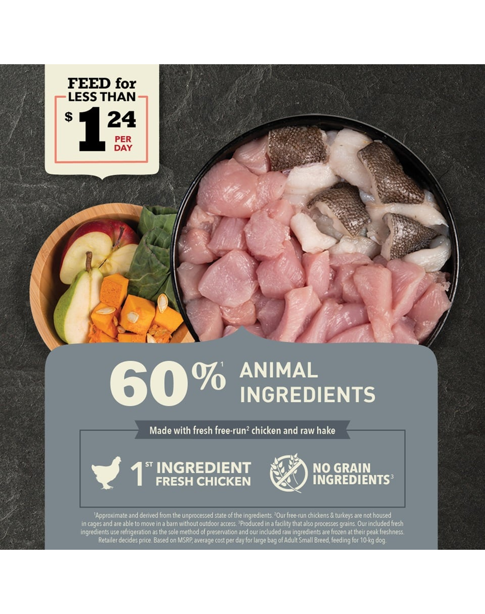 Fără proteine vegetale, ACANA Adult Small Breed are 70% carne - până la de două ori mai mult decât cele mai multe din sortimentele de hrană pentru câini.