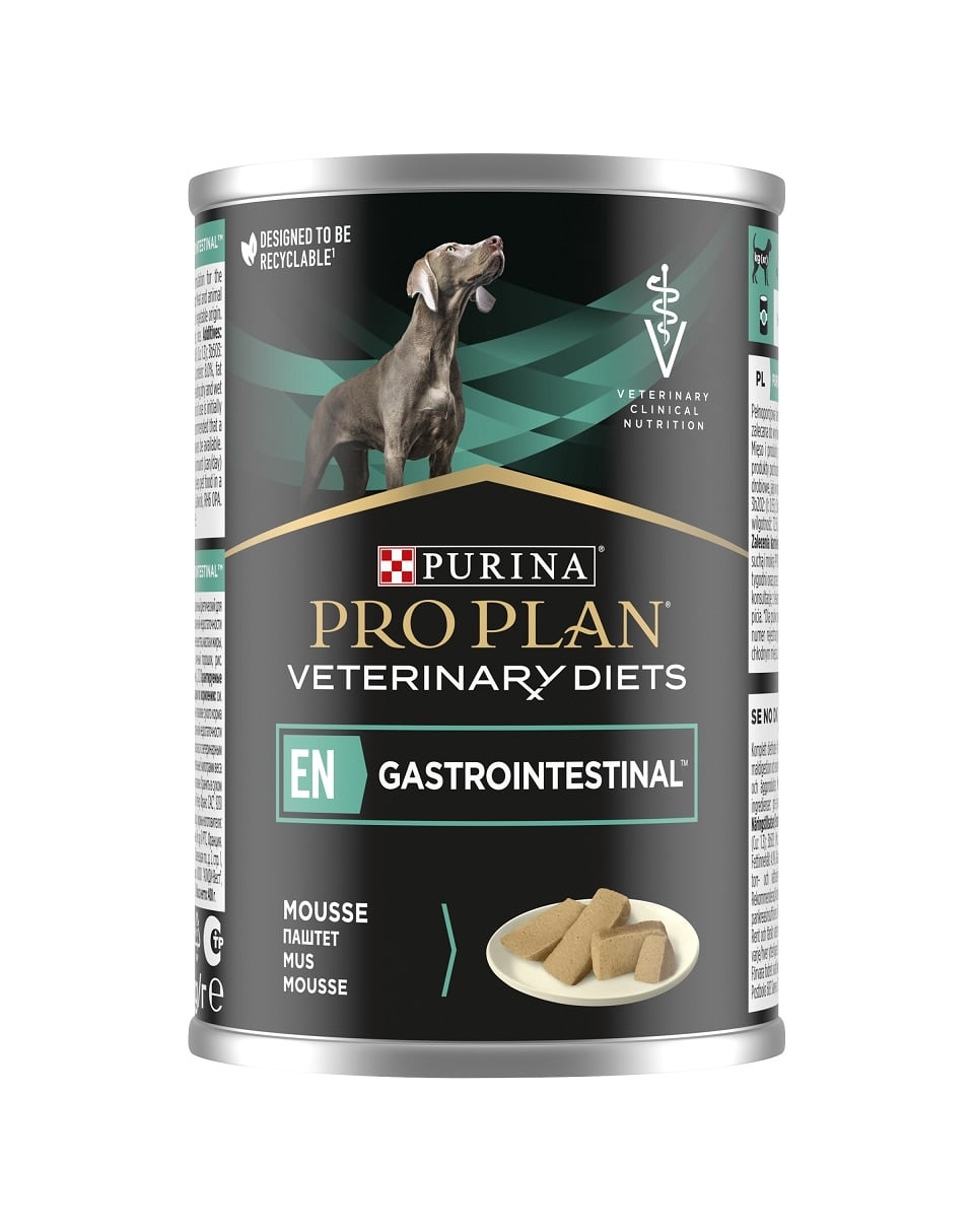 PURINA PRO PLAN Veterinary Diets Canine Gastrointestinal este o hrană umedă completă, formulată special pentru câinii care suferă de afecțiuni ale tractului digestiv, inclusiv insuficiență pancreatică exocrină și alte tulburări gastrointestinale. Rețeta este bazată pe ingrediente cu digestibilitate ridicată, menite să susțină absorbția eficientă a nutrienților și să reducă solicitarea sistemului digestiv.