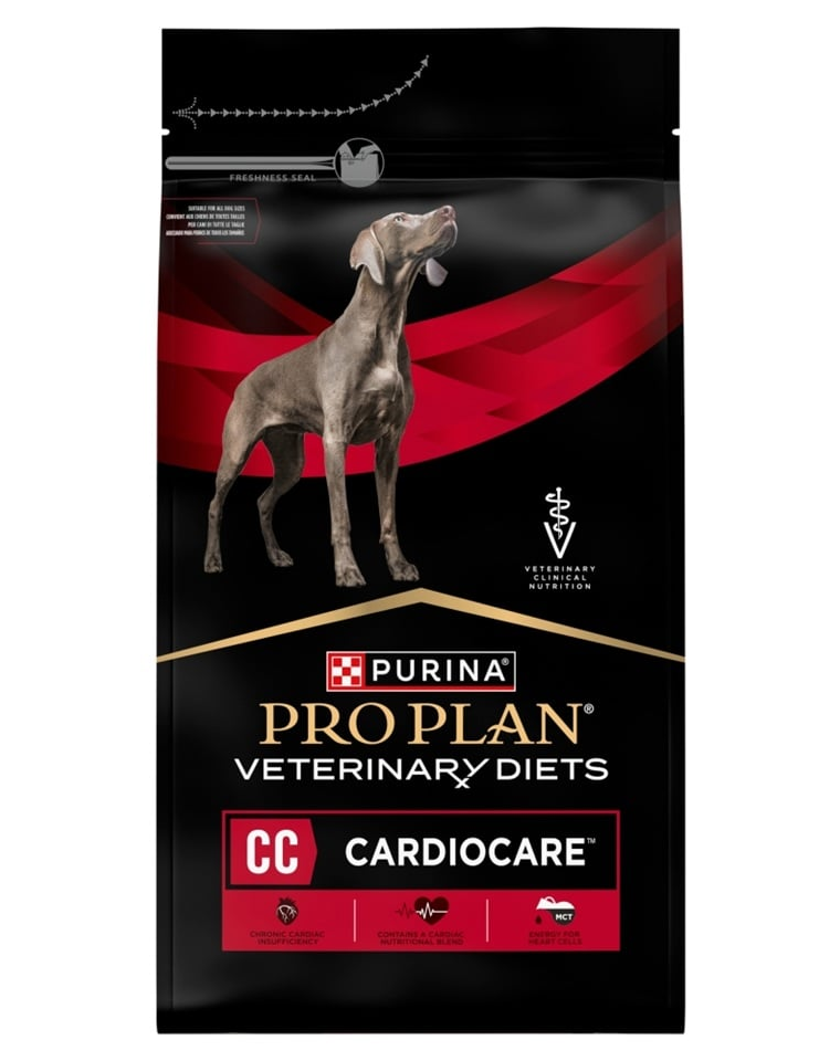 PURINA PRO PLAN Veterinary Diets Canine CC Cardiocare este o hrană dietetică completă, destinată câinilor adulți care necesită susținerea funcției inimii, în special în cazurile de insuficiență cardiacă cronică. Rețeta a fost formulată pentru a sprijini activitatea mușchiului cardiac și pentru a reduce solicitarea metabolică a sistemului cardiovascular.