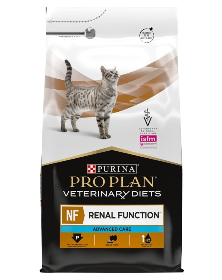 PURINA PRO PLAN Veterinary Diets Feline NF Renal Function Advanced Care este o hrană dietetică completă, uscată, destinată pisicilor adulte cu insuficiență renală cronică în stadiu avansat. Formula Advanced Care este concepută pentru a susține funcțiile rinichilor, a încetini progresia bolii și a contribui la îmbunătățirea calității vieții, printr-un aport redus de proteină de înaltă calitate și un nivel scăzut de fosfor.
