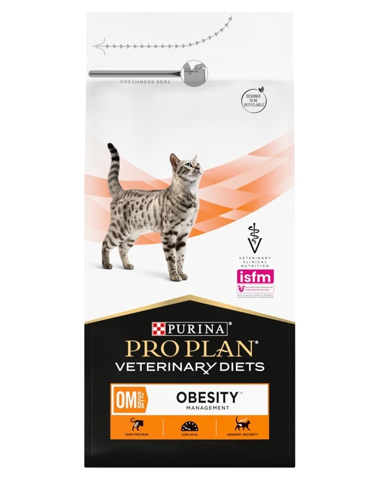 PURINA PRO PLAN Veterinary Diets Feline OM St/Ox Obesity Management este o hrană dietetică completă, uscată, destinată pisicilor adulte care necesită reducerea masei corporale și menținerea unei greutăți optime. Formula cu conținut foarte ridicat de proteină și valoare energetică redusă susține scăderea țesutului adipos, contribuind în același timp la menținerea masei musculare în timpul programelor de slăbire.