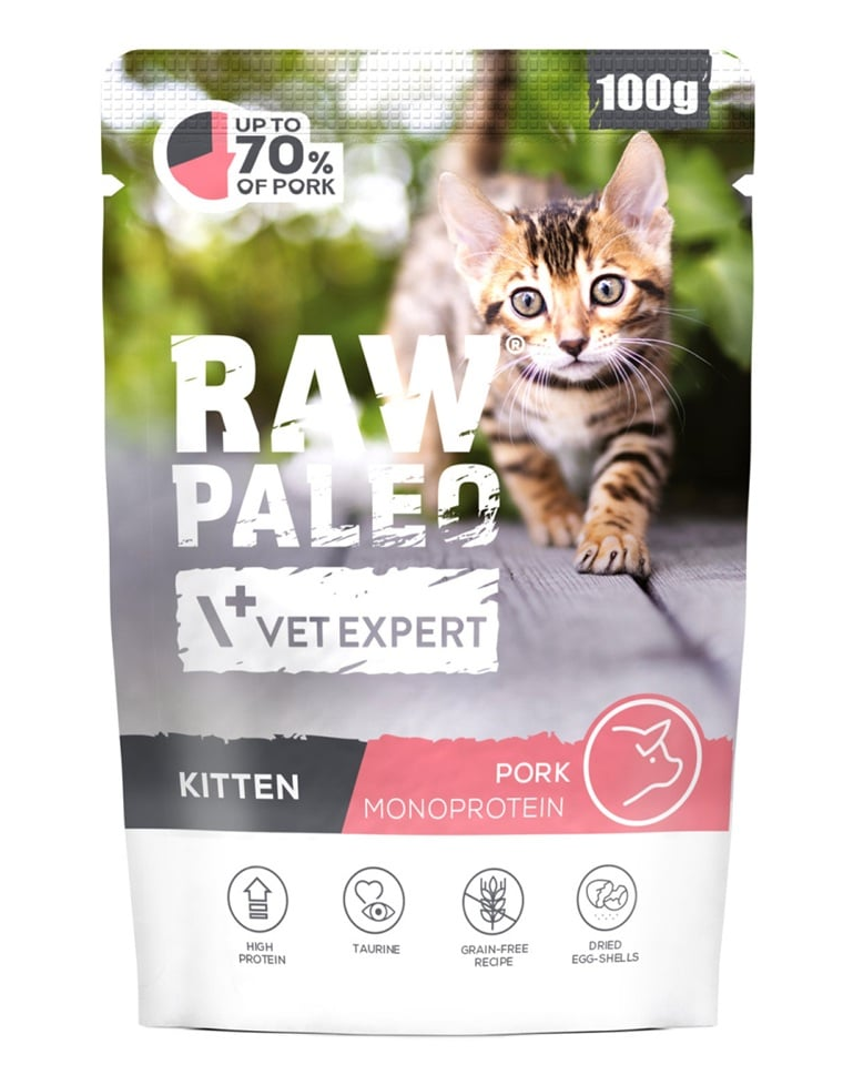 RAW PALEO Pork Kitten este o alegere nutrițională echilibrată pentru primul an de viață al pisicii, oferind un compoziție simplă și clară, care susține sănătatea, dezvoltarea și vitalitatea zilnică a puiului de pisică.
