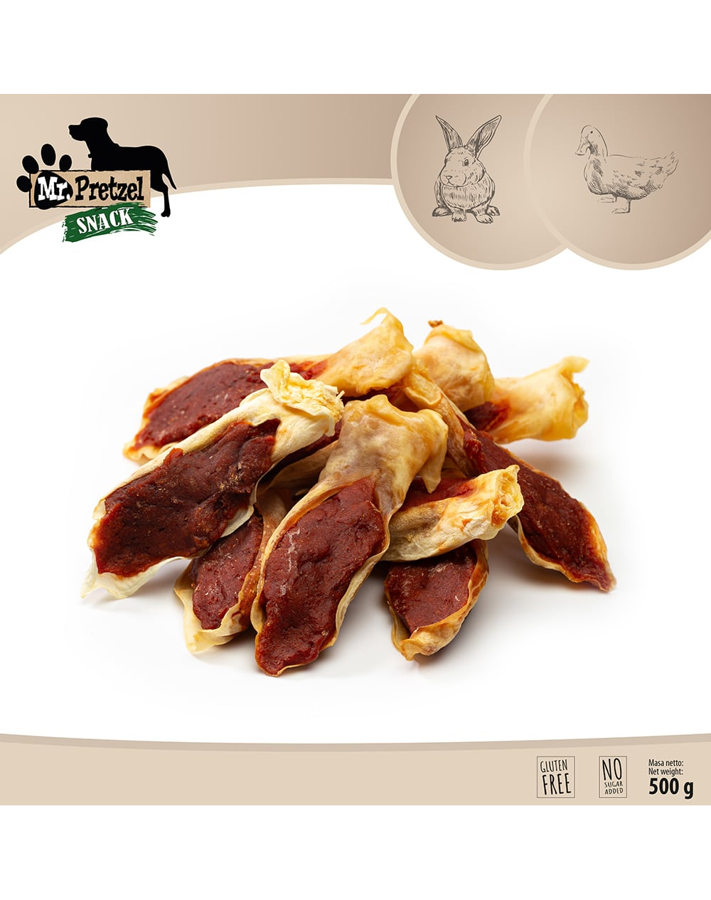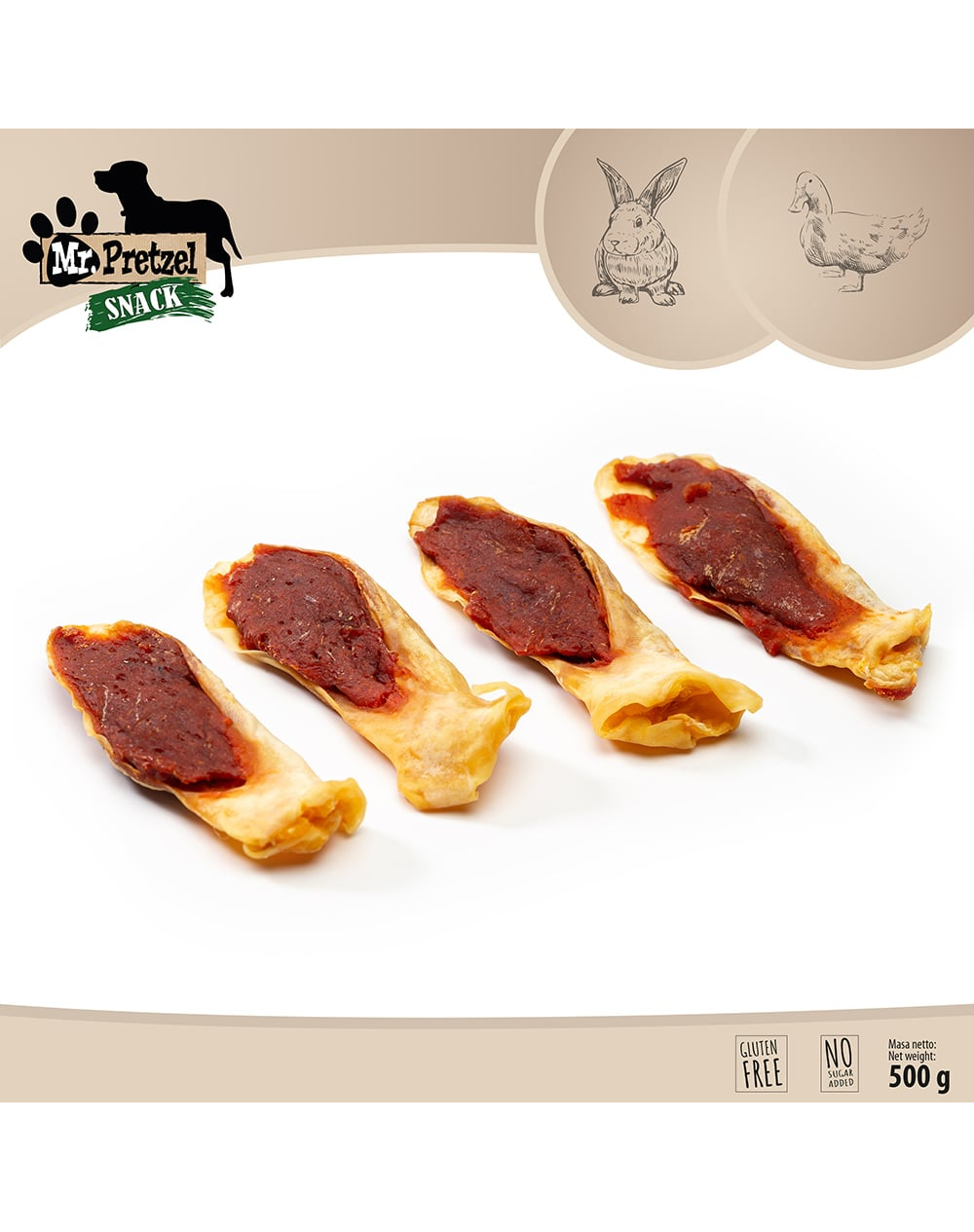 Aceste gustări oferă o experiență de mestecare mai îndelungată, datorită structurii urechii de iepure. În același timp, carnea de rață adaugă un gust intens și crește acceptabilitatea, fiind o alegere potrivită și pentru câinii mai pretențioși.
