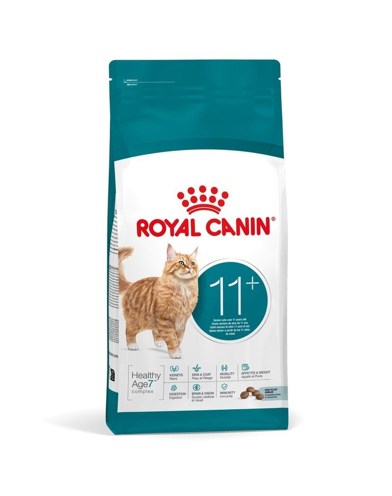 ROYAL CANIN Ageing 11+ este o hrană uscată completă, creată special pentru pisicile adulte trecute de 11 ani, care încep să prezinte semnele naturale ale îmbătrânirii. În această etapă, organismul pisicii are nevoie de o alimentație adaptată – cu un conținut optim de proteine, grăsimi și nutrienți pentru a sprijini vitalitatea, digestia, mobilitatea și sănătatea organelor.