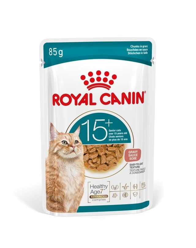 ROYAL CANIN Ageing 15+ Gravy – hrană completă și echilibrată pentru pisici în vârstă, formulată pentru a susține vitalitatea, mobilitatea și sănătatea generală după vârsta de 15 ani.