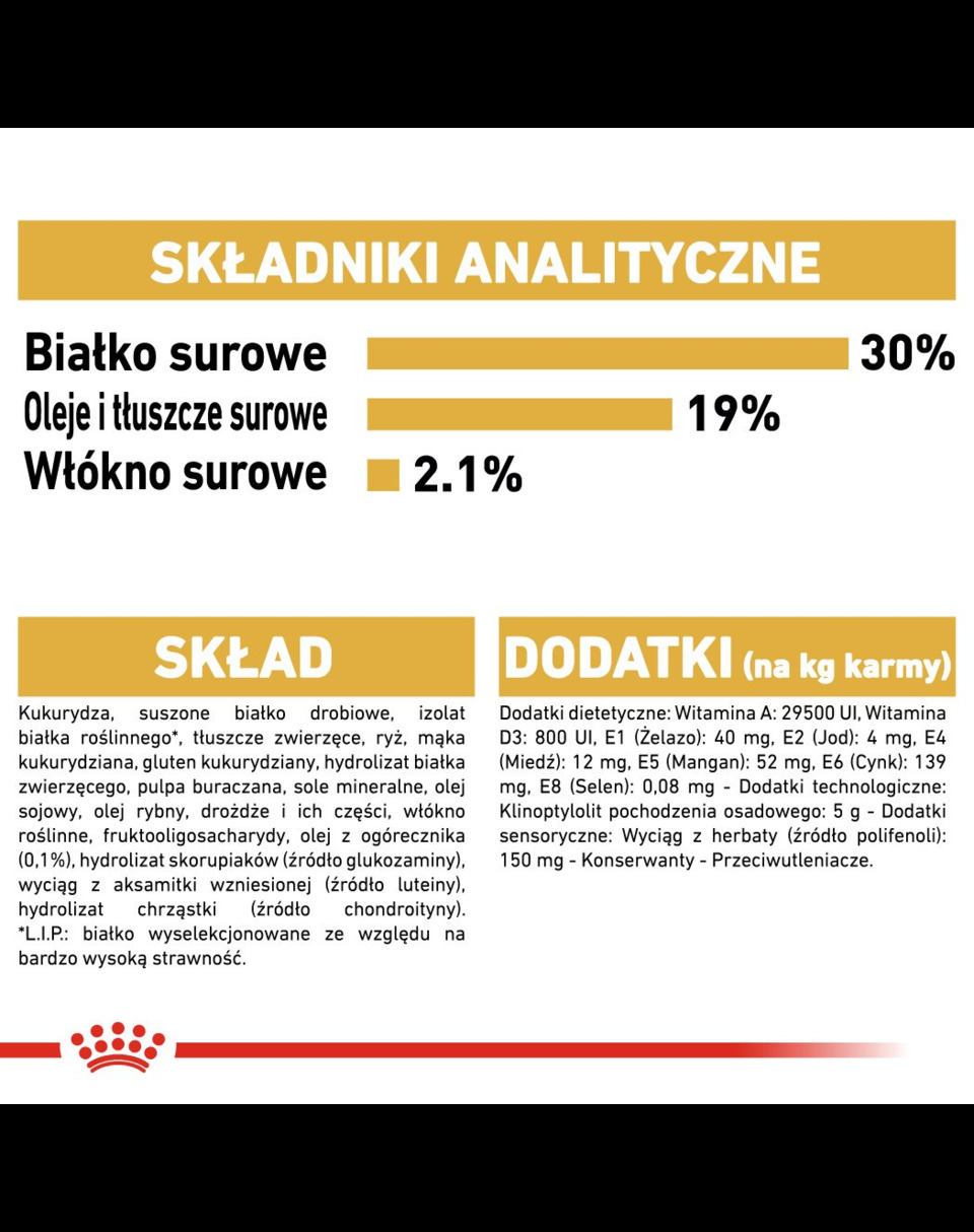 COMPOZIȚIE: Porumb, proteină deshidratată de pasăre, izolat proteic vegetal*, grăsimi animale, orez, făină de porumb, gluten de porumb, proteine animale hidrolizate, pulpă de sfeclă, ulei de soia, minerale, ulei de peşte, drojdii, fibre vegetale, Fructo-Oligo-Zaharide (FOS), ulei de Borago officinalis (0,1%), extracte de ceai verde şi struguri (sursă de polifenoli), crustacee hidrolizate (sursă de glucozamină), extract de gălbenele (sursă de luteină), cartilaj hidrolizat (sursă de condroitină).*L.I.P.: Proteină selecţionată pentru gradul său ridicat de asimilare.ADITIVI (per kg): Aditivi nutriţionali: Vitamina A: 29500 UI, Vitamina D3: 800 UI, E1 (Fier): 44 mg, E2 (Iod): 4.4 mg, E4 (Cupru): 9 mg, E5 (Mangan): 58 mg, E6 (Zinc): 173 mg, E8 (Seleniu): 0.1 mgAditivi tehnologici: Trifosfat pentasodic: 3.5 gConservanţi - Antioxidanţi.CONSTITUENȚI ANALITICI: Proteină: 30% - Grăsime: 19% - Cenușă: 5.3% - Celuloză brută: 2% - Per kg: - Acizi grași Omega 3: 7.5 g inclusiv EPA și DHA: 3 g.