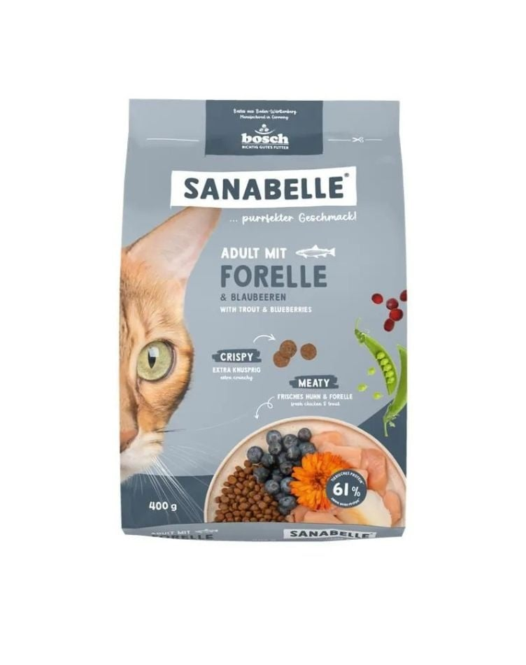 Sanabelle Adult cu păstrăv este o hrană uscată de înaltă calitate, adaptată nevoilor pisicilor adulte. Rețeta delicată, cu adaos de păstrăv proaspăt, oferă o digestibilitate excelentă și un gust deosebit, apreciat chiar și de pisicile cele mai pretențioase.
