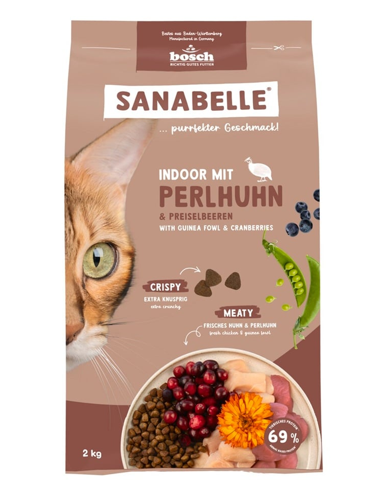 Sanabelle Indoor cu prepeliță este o hrană uscată completă, elaborată special pentru pisicile care trăiesc exclusiv în interior. Rețeta a fost adaptată la cerințele lor energetice mai scăzute și la obiceiurile specifice, cum ar fi îngrijirea frecventă a blănii și activitatea fizică limitată.