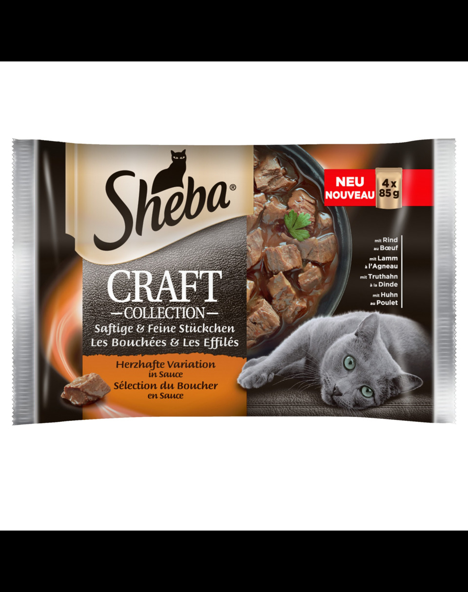 SHEBA® Craft cu carne în sos este o hrană umedă completă preparată cu măiestrie, de înaltă calitate, din colecția specială Craft. Acest amestec de lux cu bucățele cărnoase în sos catifelat va satisface și cele mai pretențioase pisici. Setul este format din 4 variante de aromă: vită, miel, curcan, pui. Fiecare plic conține substanțe nutritive care susțin funcționarea corectă a organismului pisicii. Carnea de pasăre de curte este o sursă de taurină, un aminoacid extrem de important pentru buna funcționare a sistemului nervos, precum și pentru bunăstarea inimii și ochii animalului.