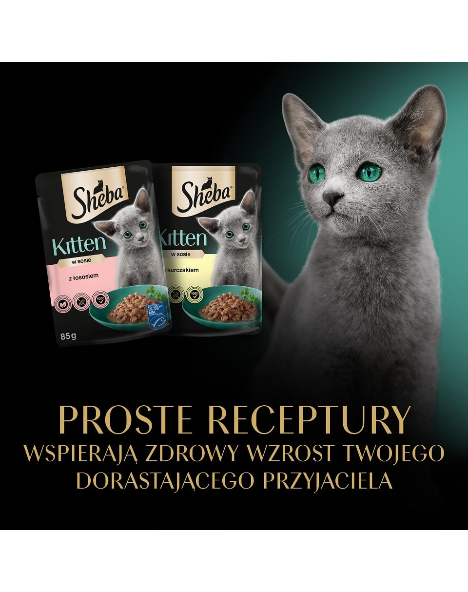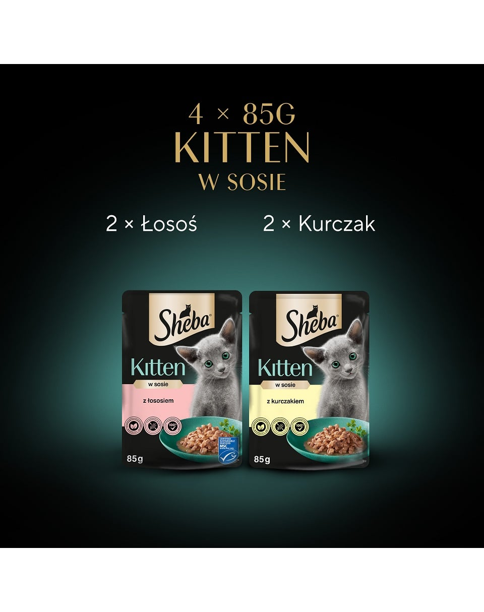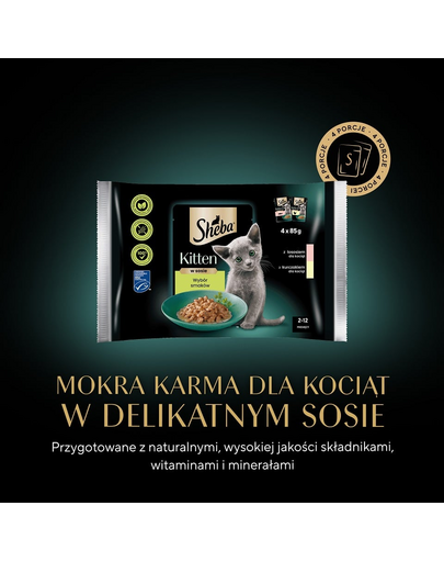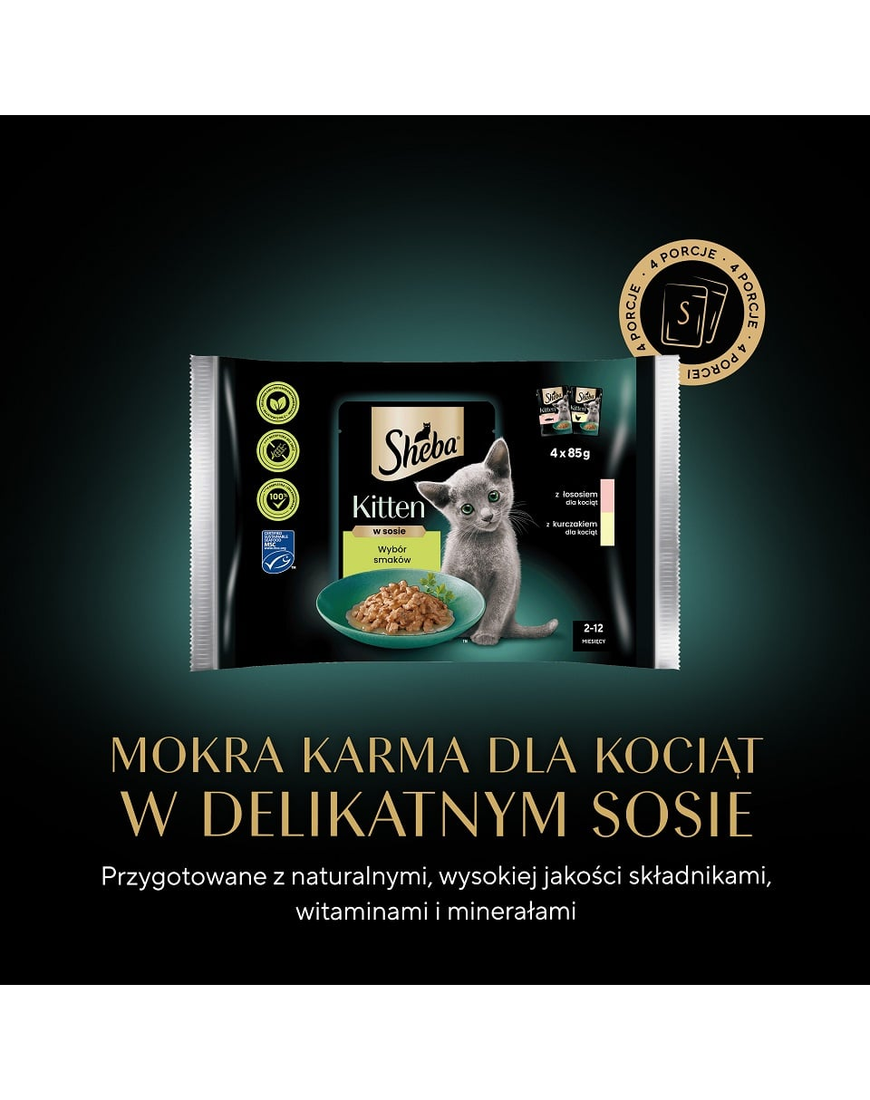 Sheba® Kitten Selection este o hrană umedă completă, special formulată pentru pisoi în creștere. Conține bucăți fragede în sos, cu somon și pui, adaptate perfect pentru gura mică a pisicilor tinere. Rețeta fără cereale este îmbogățită cu vitamine și minerale pentru a sprijini dezvoltarea sănătoasă, oasele puternice și sistemul imunitar.