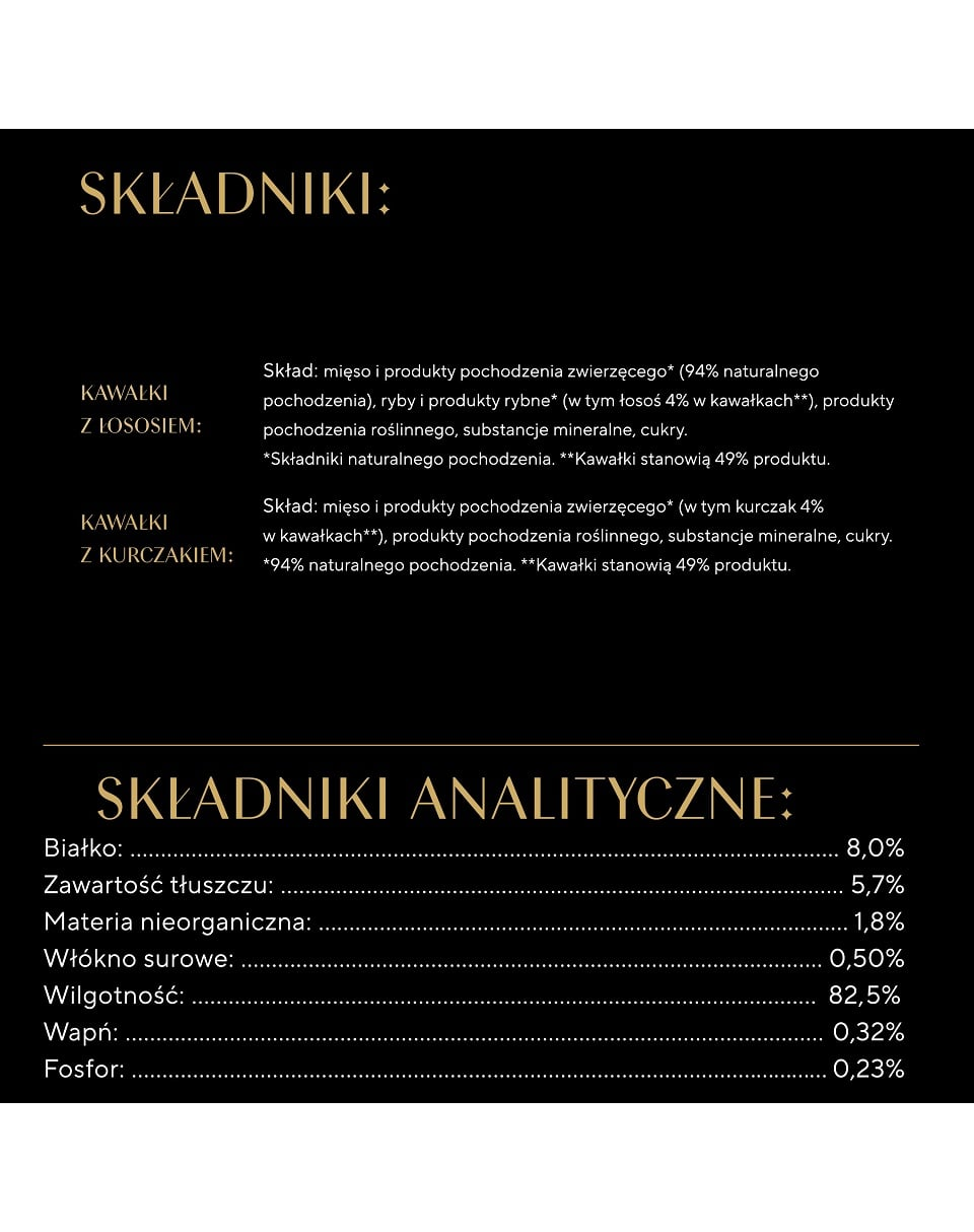 Vitamina D3: 245 UI (nu este adăugată în sortimentul cu somon), Vitamina E: 13,7 mg, Taurină: 1470 mg, Cupru: 1,5 mg, Iod: 0,34 mg, Fier: 17,1 mg, Mangan: 3,4 mg, Zinc: 15,9 mg