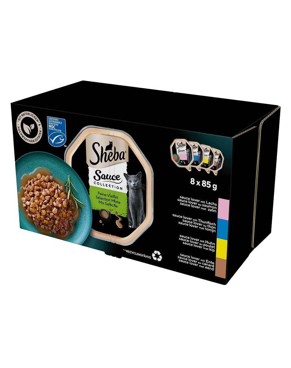 Sheba Sauce Collection Selection of Flavours este un mix de bucăți atent selecționate într-un sos catifelat. Propunerea de masă în 4 variante de arome, bucăți cu: somon, ton, pui, rață, va încânta gusturile celor mai pretențioase pisici. Secretul rețetei magistrale a Sheba Sauce Collection Selection of Flavours îl reprezintă ingredientele rafinate și vitaminele și mineralele. Fiecare tavă conține substanțe nutritive pentru a susține buna funcționare a pisicii dumneavoastră. Permiteți-i pisicii dvs. un deliciu culinar pentru a se răsfăța cu delicioasa Sheba® Sauce Collection Selection of Flavours, care va satisface chiar și cel mai pretențios apetit.