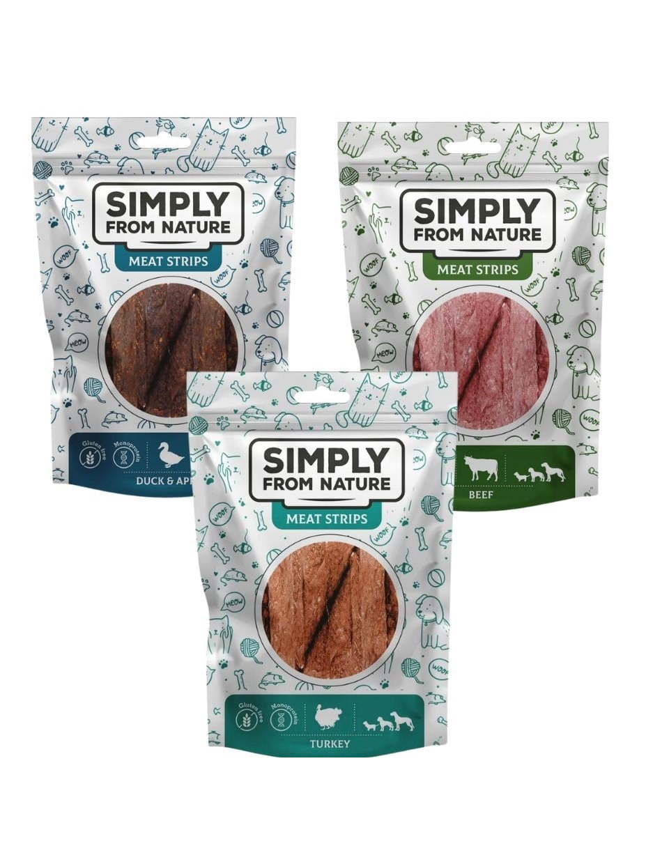 Fâșii uscate, din carne și fructe pentru câini gourmet. Fâșii de carne de la Simply from Nature ușor fragede, realizate din rață suculentă 100% și măr. Niciun câine nu poate rezista acestei combinații!