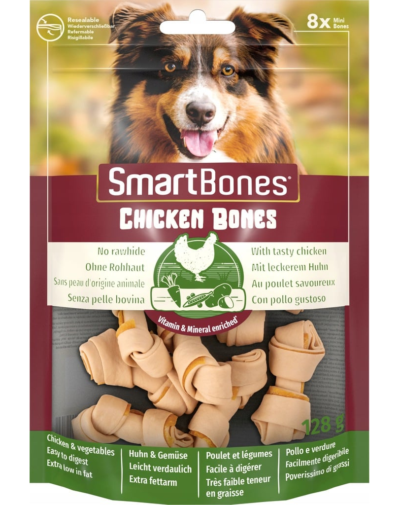 Recompensele SmartBones® sunt fără piele și, prin urmare, ușor de digerat și cu conținut scăzut de grăsimi.