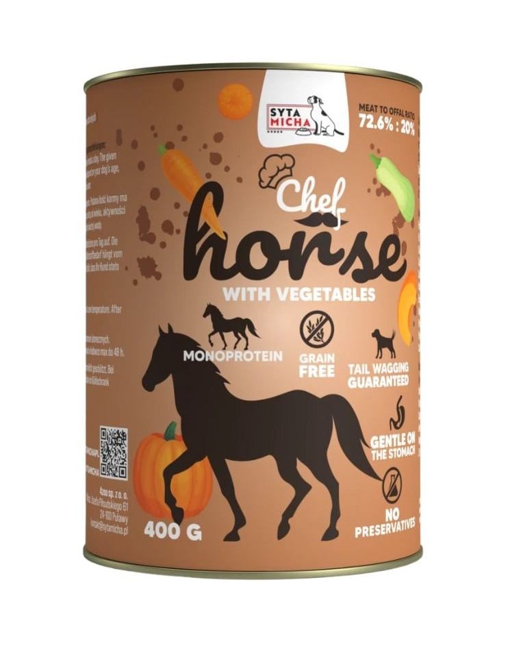Hrană umedă premium, monoproteică, destinată câinilor adulți. Rețeta a fost creată de un specialist în nutriția canină și se bazează pe o singură sursă de proteină animală – carnea de cal, ușor digerabilă și bine tolerată, completată cu legume dietetice și adaosuri funcționale naturale.