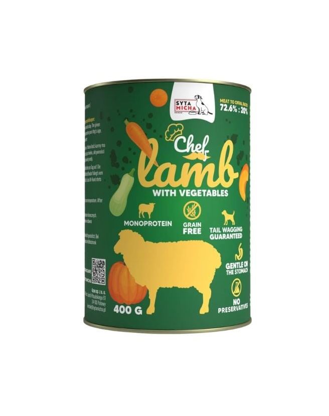 Compoziție: 92,6% miel (72,6% carne musculară, 10% stomac, 5% inimă, 5% ficat), 2,5% dovleac, 2% morcov, 2% dovlecel, 1% vitamine și minerale, 0,2% psyllium, 0,1% alge marine, 0,1% drojdie de bere