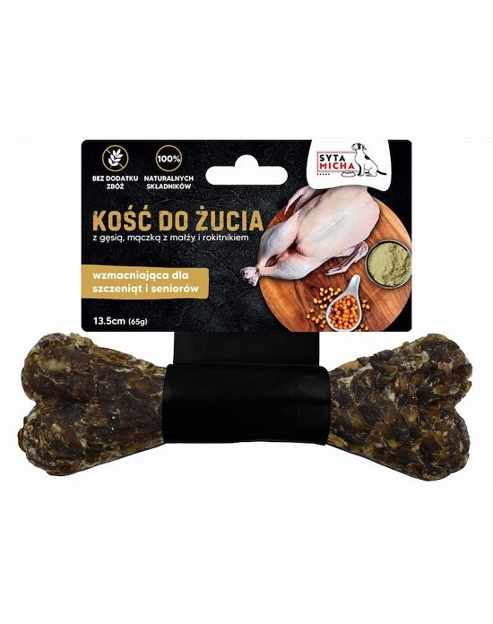 Os de mestecat întăritor pentru căței și câini seniori, 13,5 cm. Această gustare pentru câini conține carne de gâscă, scoici din Noua Zeelandă, vitamine și cătină, fiind potrivită pentru pui și câini mai în vârstă. Este o gustare extrem de gustoasă și sănătoasă, care le va oferi câinilor ore întregi de mestecat! Produsul este 100% natural, realizat din piele necolorată, cu adaosuri delicioase.