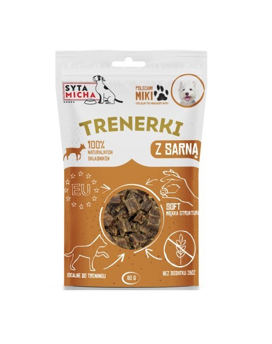 Recompensele de antrenament Syta Micha cu carne de căprioară sunt monoproteice și potrivite pentru câini de toate vârstele – juniori, adulți și seniori, indiferent de rasă. Sunt o opțiune excelentă pentru câinii sensibili sau predispuși la alergii, datorită conținutului unic de proteine și ingredientelor naturale.