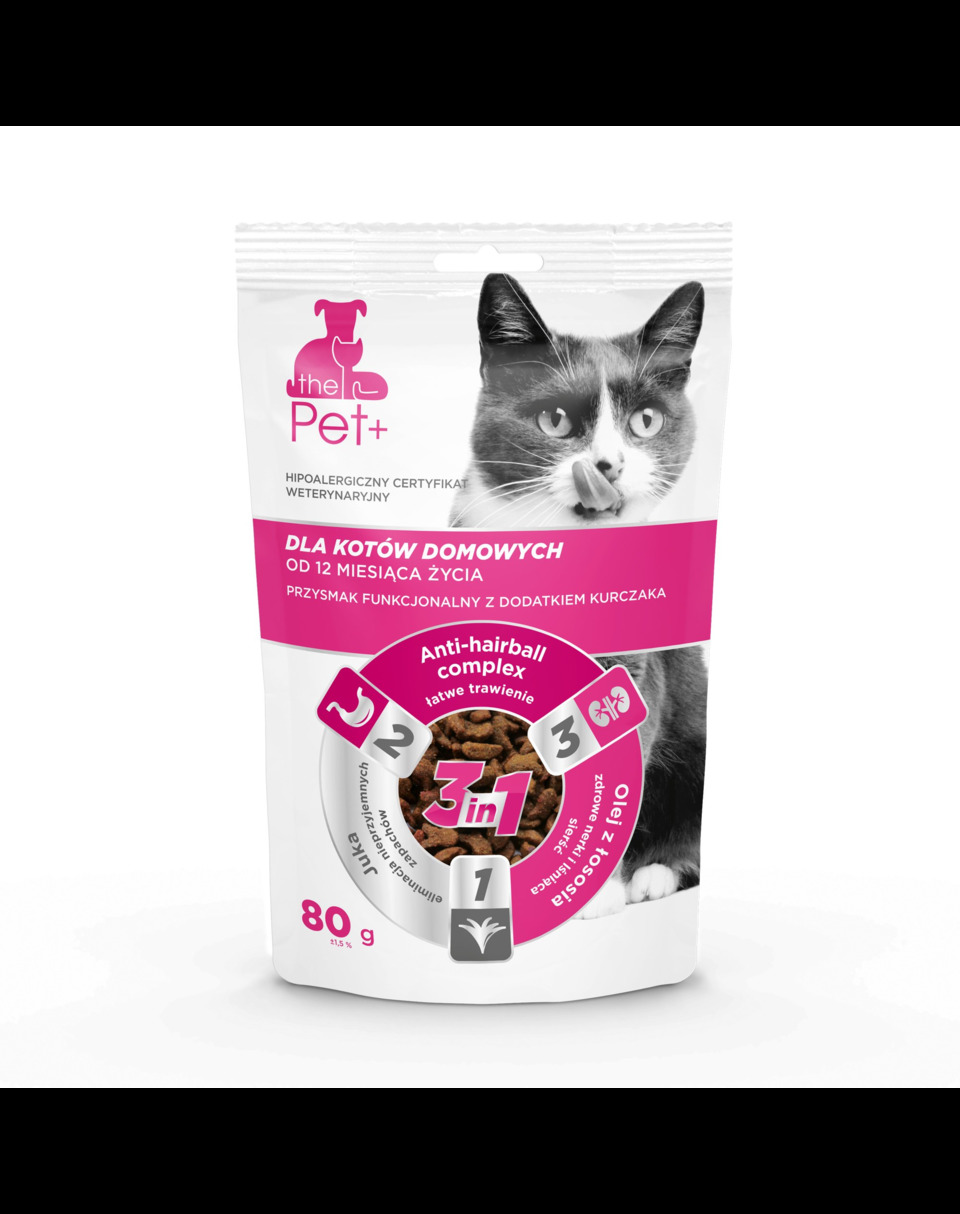 Aceasta delicatesă 3 în 1 cu adaos de pui are un complex anti ghemotoace de păr pentru a facilita digestia.