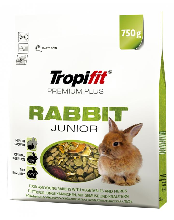 Tropifit Premium Plus Rabbit Junior este o hrană completă pentru iepurii tineri (de la 8 săptămâni până la 1 an) pe bază de pelete bogate în fibre, cu ierburi, lucernă, mere și semințe de floarea-soarelui, precum și legume uscate bogate în vitamine și ierburi aromatice.