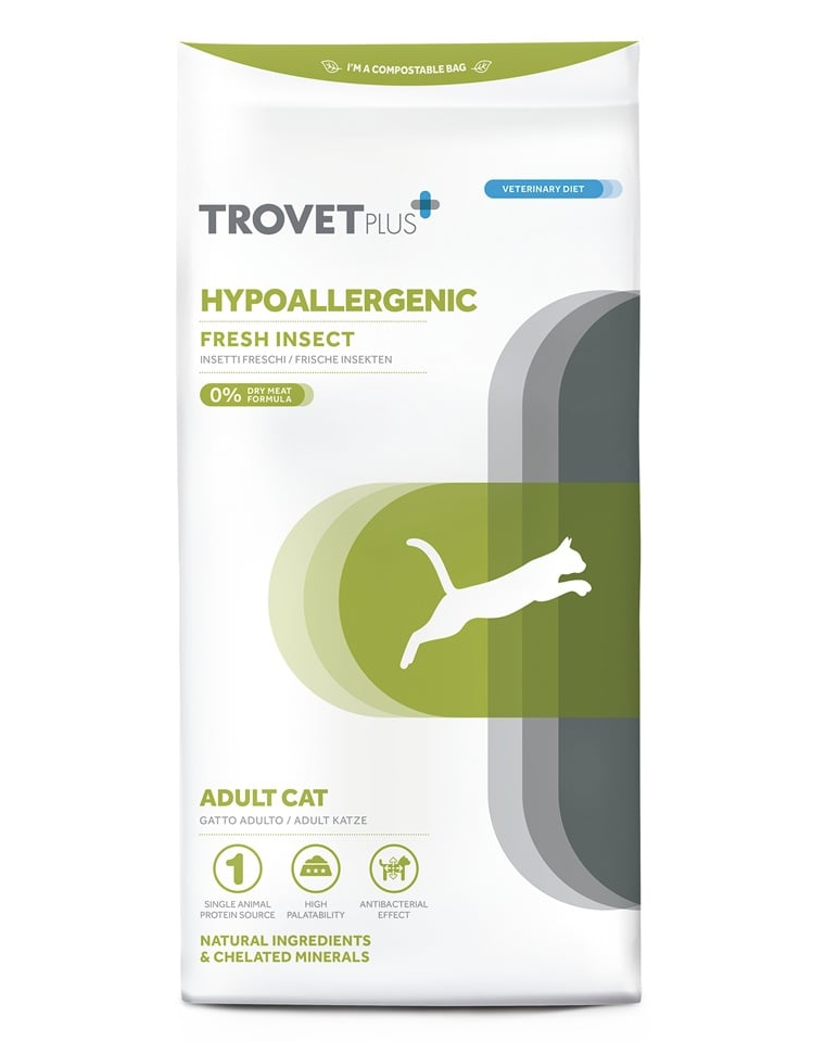 Dietă veterinară hipoalergenică pentru pisici adulte. TROVET Plus Hypoallergenic Fresh Insect IRD este o hrană dietetică completă pentru pisici adulte, formulată pentru reducerea intoleranțelor la anumite ingrediente.