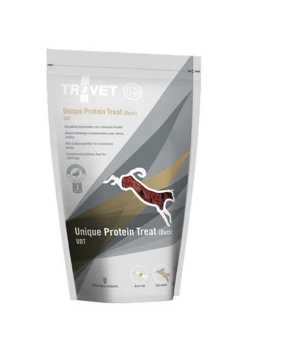 TROVET Unique Protein Treat Duck (UDT) este o hrană complementară premium, destinată câinilor adulți. Aceste recompense au la bază o singură sursă de proteine animale – carnea de rață – ceea ce le face ideale pentru câinii sensibili, cu alergii alimentare sau în diete de eliminare.