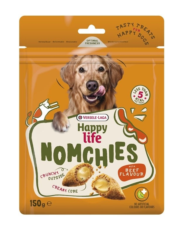 Versele-Laga Happy Life Snack Nomchies Beef este o gustare crocantă pentru câini, cu interior cremos și un aport funcțional dedicat menținerii sănătății dentare. Fiecare bucățică are sub 5 kcal, ceea ce o face potrivită pentru utilizare zilnică, fără risc de aport caloric excesiv.