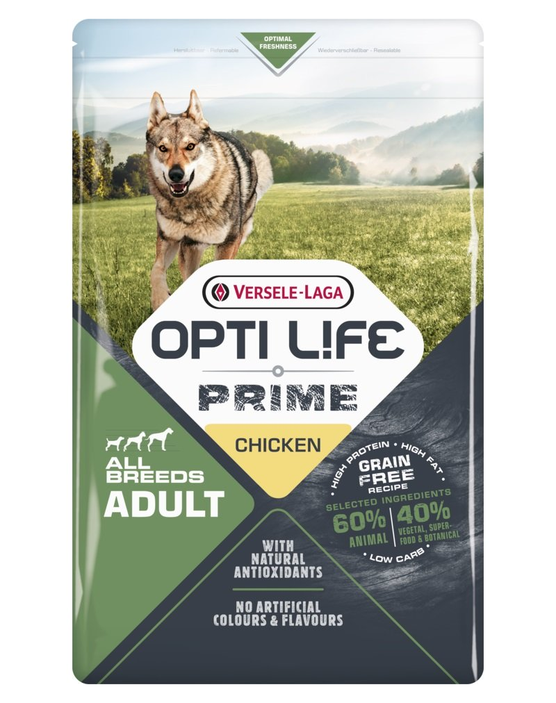 Cu Opti Life Prime Adult Chicken, îi oferiți câinelui dumneavoastră o masă completă și gustoasă, de calitate superioară, plină de nutrienți valoroși. Formula noastră fără cereale are un conținut ridicat de proteine și grăsimi și un conținut scăzut de carbohidrați. Este amestecul perfect, realizat cu ingrediente de cea mai bună calitate, gustoase și naturale, pentru a oferi energie pentru o zi plină de aventuri.
