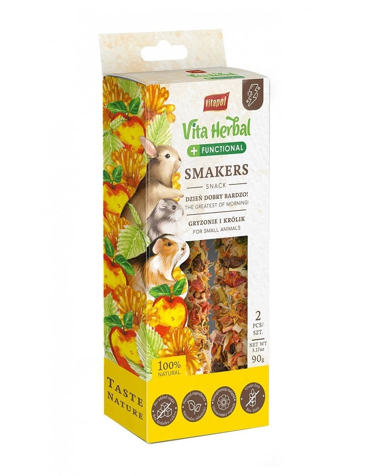 VITAPOL Vita Herbal Functional Smakers „Bună dimineața!” este alegerea ideală pentru proprietarii care doresc să asigure o dietă echilibrată și variată animalelor lor. Bogat în ingrediente naturale, produsul sprijină starea generală de sănătate și oferă un plus de vitalitate. Utilizarea regulată ajută rozătoarele și iepurii să fie mai activi și mai sănătoși în fiecare zi. Ambalajul practic menține prospețimea gustării pentru o perioadă îndelungată.
