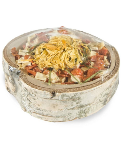 Lemn de mesteacăn uscat, morcovi uscați, păstârnac uscat, tulpini de pătrunjel uscat, flori de gălbenele uscate, amidon.