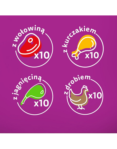 Bucăți de carne de pasăre - compoziție: carne și produse de origine animală (34%, inclusiv 4% carne de pasăre în bucăți*), cereale, produse de origine vegetală, minerale, zaharuri. *bucățile de pasăre reprezintă, de obicei, 40% din produs.