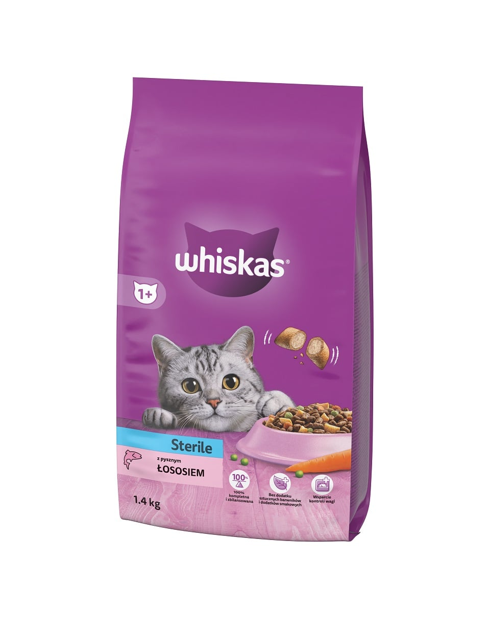 Hrană uscată completă pentru pisici sterilizate. WHISKAS Sterile cu somon este o hrană uscată 100% completă și echilibrată, formulată special pentru pisici adulte după sterilizare sau castrare. Rețeta este optimizată pentru a furniza mai puține calorii per porție, contribuind la menținerea greutății corporale după intervenție.