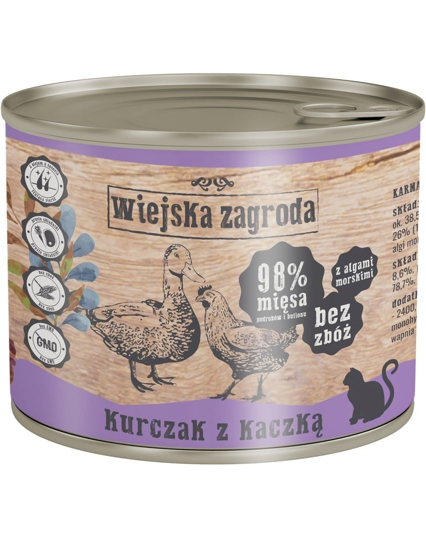 Mâncarea este o combinație de două cărnuri într-un bulion aromat făcut de ei înșiși. Carnea de pui și de rață, împreună cu măruntaiele, reprezintă cea mai bună sursă de proteine pentru pisici. Suplimentat cu ulei de somon, care furnizează acizi grași nesaturați Omega pentru a întări imunitatea, blana și sistemul nervos al pisicii dumneavoastră. Algele marine sunt o sursă de iod.