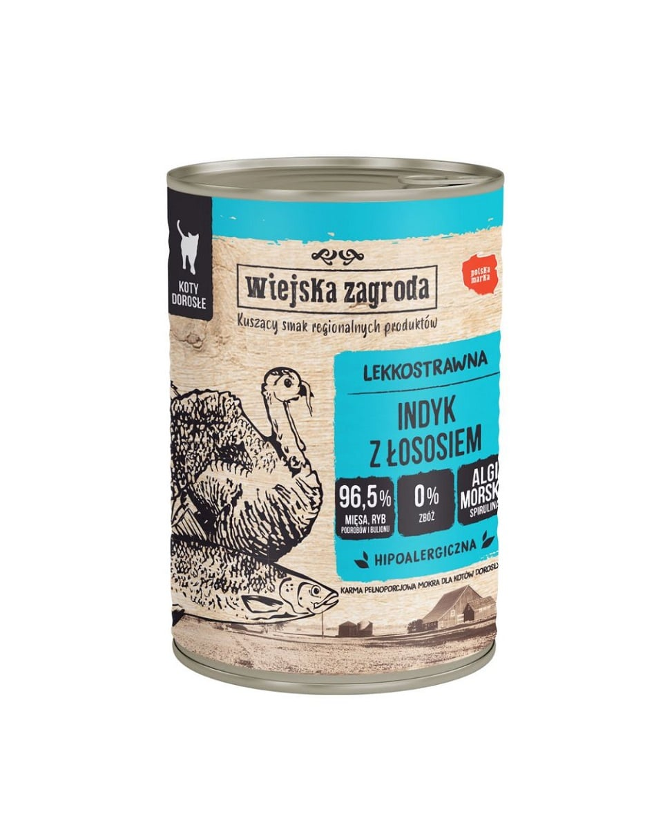 Baza hranei este reprezentată de cărnuri, pește și organe comestibile atent selectate, servite în sos aromat. Carnea de curcan este ușor digerabilă, slabă și bogată în proteine nutritive. Combinată cu somon (o sursă valoroasă de acizi Omega 3 și vitamina D), aceasta constituie o masă delicioasă și sănătoasă.
