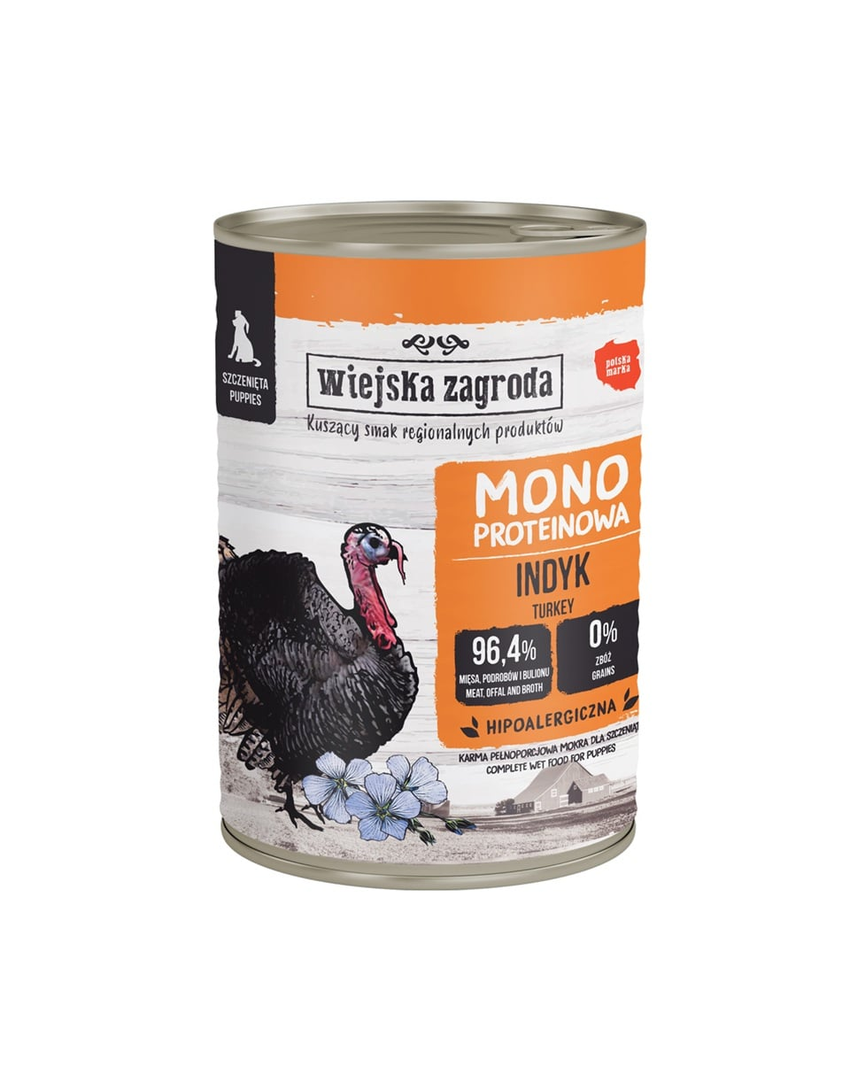 Descoperă hrana umedă monoproteică Wiejska Zagroda pentru câini. Fiecare conservă conține un singur tip de carne, care se află pe primul loc în compoziție! De asemenea, conține ingrediente superioare sub formă de fructe, legume și ierburi, care au roluri suplimentare în menținerea sănătății și vitalității câinelui tău.