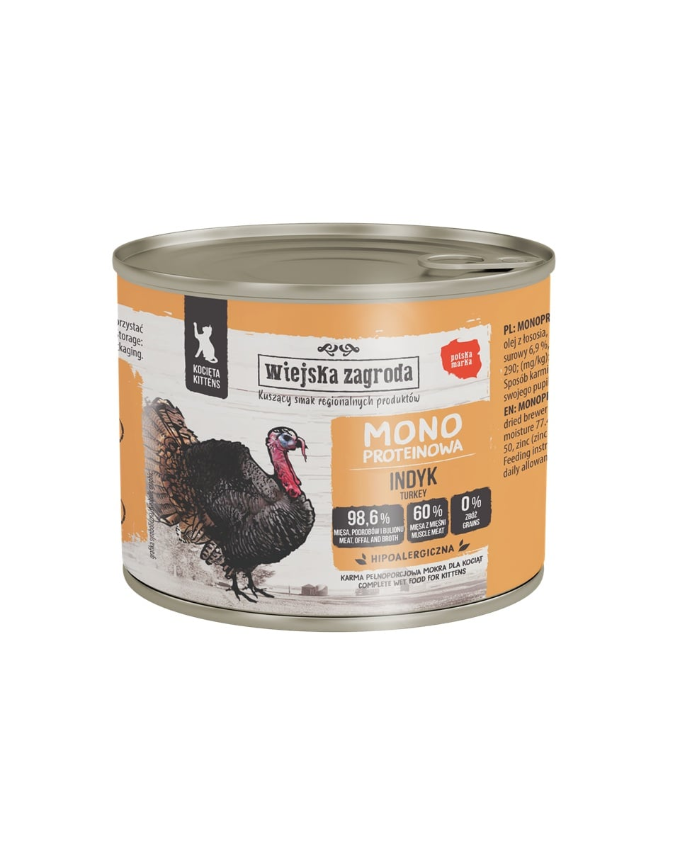 Faceți cunoștință cu hrana umedă monoproteică Wiejska Zagroda pentru pisoi. Fiecare conservă conține un singur tip de carne, care se află pe primul loc în lista ingredientelor.