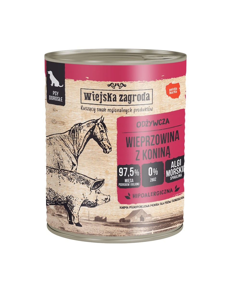 Wiejska Zagroda este un brand polonez care a apărut din nevoia de a oferi câinilor noștri ceea ce au nevoie, adică carne! Hrana umedă Wiejska Zagroda este o masă completă și sănătoasă pentru câine, indiferent dacă este mic, mare, cu păr scurt sau cu păr lung. Câinele este un carnivor, iar noi ne-am asigurat că în meniul nostru se regăsește doar ce este mai bun. Baza mesei este, așadar, un duet de cărni și organe atent selecționate. Acestea sunt cele mai importante și mai valoroase ingrediente, care sunt scufundate într-un bulion aromat. Combinația de carne de porc cu carnea de cal ușor digerabilă este o alegere excelentă pentru câini, în special pentru cei activi. Un adaos valoros este uleiul de somon, adică o bogăție de acizi grași Omega-3 EPA și DHA, care, printre altele, susțin funcția cardiacă și funcționarea corectă a creierului. De asemenea, influențează pozitiv sănătatea pielii și a blănii animalului. Un alt ingredient unic sunt algele marine benefice, care reprezintă o bogăție de vitamine, minerale și substanțe nutritive valoroase. Acest ingredient prețios va întări sistemul imunitar și va influența excelent sistemul digestiv al patrupedului. Ingredientele simple, fără aditivi inutili precum cereale, soia sau amelioratori de gust, sunt rețeta noastră pentru sănătatea și vitalitatea prietenului dumneavoastră.