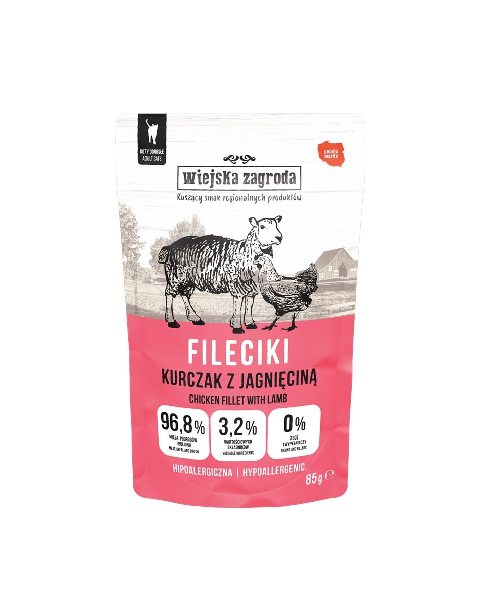 Wiejska Zagroda hrană umedă pentru pisici – fileuri de pui cu miel este alegerea ideală pentru pisicile adulte.