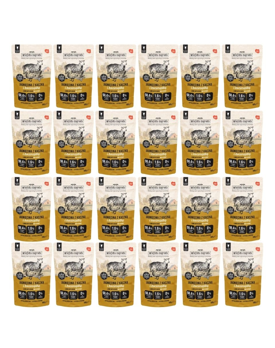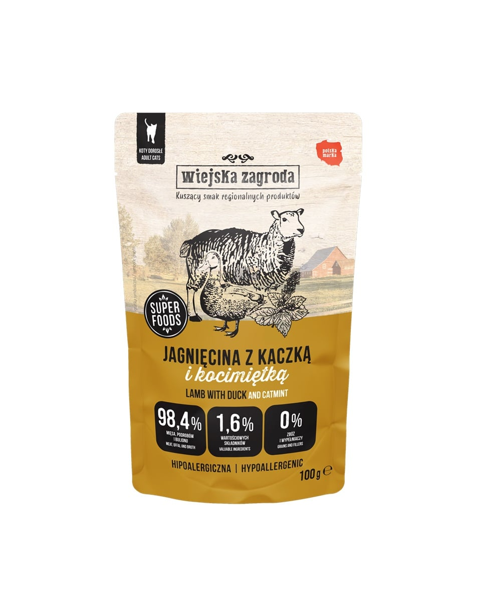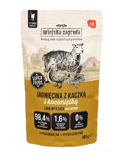 Cauți o hrană umedă naturală pentru pisici sub formă de pate delicat și aromat? Wiejska Zagroda cu miel și rață, îmbogățită cu iarba mâței, este alegerea ideală. Fiecare plic conține 98,4% carne atent selecționată, organe și bulion, oferind un gust delicios și valoare nutritivă ridicată. Formula fără cereale și ingredientele funcționale o fac potrivită chiar și pentru pisicile cu digestie sensibilă.