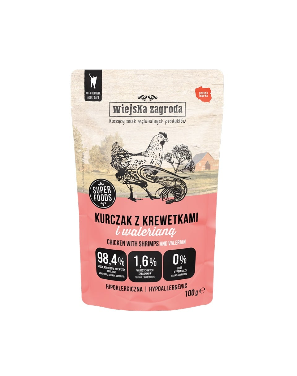De ce merită să alegi hrana umedă Pui cu creveți cu adăugare de valeriană Wiejska Zagroda?