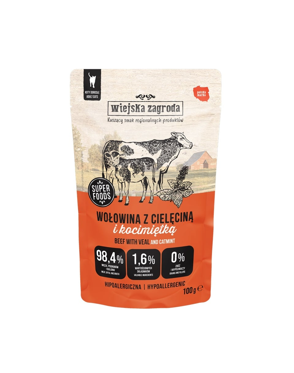 Wiejska Zagroda hrană umedă pentru pisici Vită cu vițel este alegerea ideală pentru mesele zilnice ale pisicilor adulte. Datorită conținutului ridicat de carne și organe, precum și a ingredientelor funcționale, această hrană va satisface chiar și cele mai exigente feline. Plicurile practice de 100 g fac hrănirea pisicii ușoară și convenabilă. Alege un brand polonez apreciat pentru calitatea superioară a ingredientelor și oferă-i pisicii tale tot ce este mai bun!