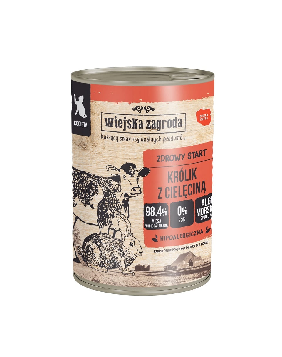 40 % iepure (22 % carne, 18 % măruntaie), 30 % carne de vițel (9 % carne, 8 % ficat, 8 % plămâni, 5 % inimă), 28,4 % bulion de iepure și de vițel, 1 % minerale, 0,5 % ulei de somon, 0,1 % spirulină.